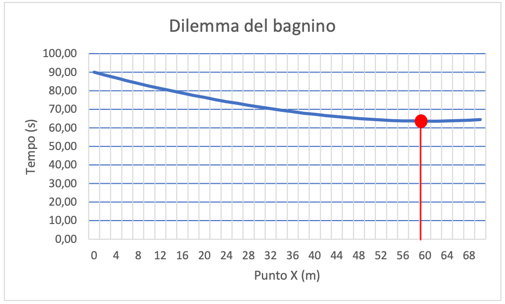 Supponiamo che sia: vT = 5 m/s; vA = 1 m/s (ottimo atleta!); a = 20 m; b = 50 m; d = 70 m (le proporzioni del disegno). Ora facciamo i calcoli, e disegniamo il diagramma. Come si vede, il tempo minimo si ottiene quando X si trova a 60 m: è il punto indicato nel disegno.