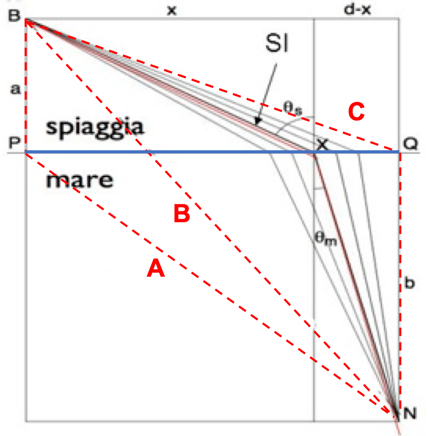 Il bagnino andrà d’istinto ma un calcolo consente di trovare il punto X tale per cui la somma dei tempi da B a X, correndo sulla sabbia, più il tempo da X a N, nuotando, è il minimo possibile. Sul disegno sono tratteggiati in rosso tre percorsi alternativi: