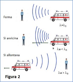 Consideriamo una sorgente che emette onde sonore, come la sirena di un’ambulanza e un osservatore fermo al bordo della strada (figura 2). Quando l’ambulanza è ferma l’osservatore percepisce un suono di lunghezza d’onda l0, ma quando l’ambulanza si avvicina il suono diventa più acuto (l diminuisce), mentre quando si allontana diventa più grave (l aumenta). Infatti, la lunghezza d’onda apparente la percepita dall’osservatore cambia quando la velocità relativa sorgente-osservatore vrel è diversa da zero. Il fenomeno è detto “effetto Doppler” e prende il nome dal matematico e fisico austriaco Christian Andreas Doppler che lo descrisse per primo nel 1845.