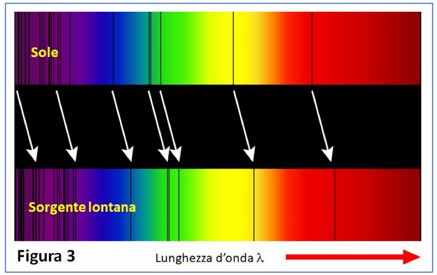 La figura 3 mostra in alto lo spettro nel visibile della luce del Sole: le righe nere sono le righe di assorbimento dell’idrogeno, uno degli elementi più diffusi nell’universo. In basso viene riportato lo spettro di una sorgente lontana nello stesso intervallo di frequenze. Si nota come le righe di assorbimento sono disposte in maniera simile, ma risultano spostate verso il rosso.